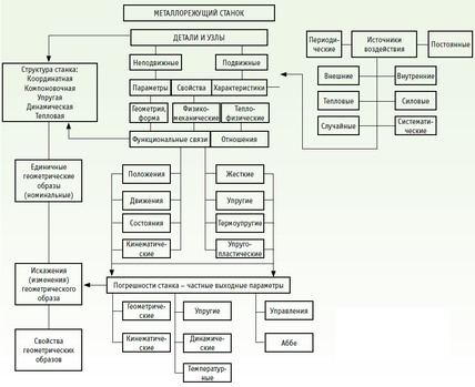 Металлорежущий станок при анализе точности рассматривается как система (рис.10), состоящая из множества деталей и узлов, которые в соответствии с заданными и осуществляемыми функциями делятся на две группы: неподвижные и подвижные. К ним относятся: станины, колонны, столы, салазки, каретки, направляющие, шпиндельные бабки и т.п., которые в разных случаях могут быть как подвижными, так и неподвижными − фиксированными (например, стол может быть как подвижным с линейным перемещением или вращением, так и неподвижным, то есть фиксированным, колонна также может быть как подвижной, так и неподвижной и т.д.). Детали и узлы, в свою очередь, характеризуется присущими им параметрами, свойствами и характеристиками: геометрическими размерами и формой, физико-механическими характеристиками и теплофизическими свойствами материала, параметрами теплообмена с окружающей средой и сопряженными элементами станка.