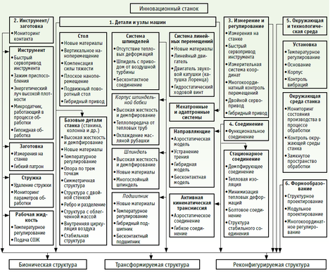 Системно-мехатронный подход значительно сложнее модульно-мехатронного в силу большей сложности объекта оптимизации. Даже оставаясь нереализуемым, он служит конечной целью или пределом, к которому следует стремиться. Сложность системно-мехатронного подхода логично объясняет тот факт, что мехатроника началась именно с создания однофункциональных компонентов. Следовательно, особенности мехатронного подхода позволяют получать синергетический эффект функционального интегрирования в виде улучшения технических и эксплуатационных параметров устройств, таких как надежность, эффективность, удельное энергопотребление и т.д., а также создавать уникальные компоненты и системы, по существу не реализуемые без подобных технологий разработки и изготовления. На рис. 12 приведена принципиальная структура инновационного станка – станка будущего, структура, свойства и характеристики которого определяются системой элементов, реализующих иные физические принципы взаимодействия, построение которых основано на одной из трех структур: трансформируемой, реконфигурируемой или бионической. Очевидно, что процесс достижения этой цели будет поэтапным и потребует соответствующих исследований и разработок на основе указанных физических принципов.