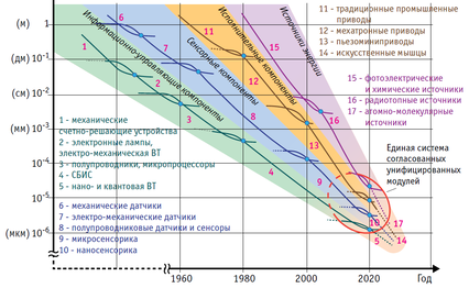 Первый качественный прорыв был сделан в информационно-управляющих компонентах на базе 2D-микроэлектронных технологий. До последнего времени подобные компоненты продолжают лидировать в процессе интеллектуализации и практически уже не лимитируют общий прогресс миниатюризации технических систем в целом. С точки зрения прогресса наиболее важными стали микроминиатюризация сенсорных компонентов на базе ЗD-микросистемных технологий, появление микро-электро-механических систем (МЭМС) и микро-опто-электро-механических систем (МОЭМС). Основными компонентами, сдерживающими дальнейшую миниатюризацию технических систем, являются исполнительные (силовые) компоненты. Они до настоящего времени базируются в основном на технических идеях двигателей 19 века. Их будущий прогресс связан с созданием микроминиатюрных исполнительных устройств.