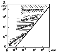 Неровности на реальных поверхностях твердого тела различаются масштабом и играют различную роль в процессах контактного взаимодействия. На рис. 2 представлена классификация изменений высот неровностей H и расстояний между ними S, соответствующих различным видам отклонений от правильной геометрической формы.