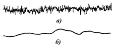 Рис. 6. Профилограмма стальной поверхности после шлифования: а – вертикальное увеличение 40000, горизонтальное 400; б – действительный профиль поверхности при одинаковом вертикальном и горизонтальном увеличении.