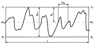 Для оценки микрогеометрии поверхности пользуются ее профилем, представляющим собой сечение поверхности плоскостью, перпендикулярной к этой поверхности и ориентированной в некотором заданном направлении. Запись профиля поверхности называется профилограммой. Профилограмму, записанную в направлении, перпендикулярном к следам обработки (или следам результата изнашивания), называют поперечной, а в направлении следов обработки - продольной. Параметры шероховатости поверхности определяют в результате обработки участка профилограммы на определенной базовой длине l (рис. 3), используемой для выделения неровностей, характеризующих шероховатость поверхности, и для количественного определения её параметров. Обычно l = 0,25 или 0,80 мм. При измерении параметров профиля за линию отсчета принимают среднюю линию M1M2, имеющую форму номинального профиля, которую проводят так, чтобы в пределах базовой длины среднеквадратичное отклонение профиля от этой линии было минимальным. Параллельно средней линии в пределах базовой длины проводят линию выступов профиля А1А2 через высшую точку профиля и линию впадин профиля В1В2 через низшую точку профиля. Шероховатость поверхности, измеренную в направлении главного движения при резании, называют продольной, а в направлении подачи — поперечной шероховатостью.