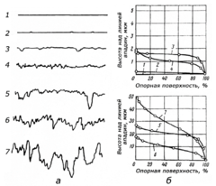 Рис. 5. Профильные кривые (а) и кривые опорной поверхности (б) для различных поверхностей: 1 - идеальной; 2 - мерительной плитки; 3 - после лапингования; 4 - после шлифования; 5 - после фрезерования; 6 - после тонкого растачивания; 7 - после сверления.