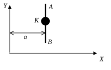 23. Капля жидкости K, находящаяся на середине проволоки АВ, равномерно растеклась по ней (см. рисунок). Как изменились моменты инерции жидкости относительно осей X и Y? Масса капли равна m, длина проволоки – l, расстояние от оси Y до проволоки равно a.