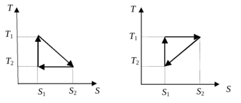15. Тепловые машины с произвольным веществом в качестве рабочего тела совершают обратимые термодинамические циклы, показанные на рисунках. Выразить КЦД этих циклов через максимальную T1 и минимальную T2 температуру газов.