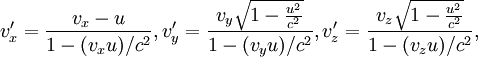 Для скоростей, близких к скорости света преобразования Галилея становятся несправедливы. При переходе из системы S в систему S' необходимо использовать преобразования Лоренца для скоростей: