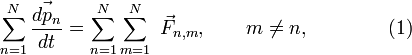 где суммирование идет по всем силам, действующим на n-ю частицу со стороны m-ой. Согласно третьему закону Ньютона, силы вида