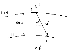 , вычислим элементарную работу по перемещению материальной точки из точки 1 в близко расположенную точку 2. Через точки 1 и 2 проведем эквипотенциальные поверхности, т.е. поверхности одинакового потенциала, которые находятся на расстоянии