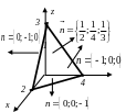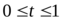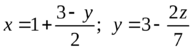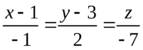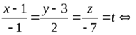 : при х = 1, t = 0; при х = 0, t = 1 (это же получим по другим переменным: при у = 3, t = 0; при у = 5, t = 1; при z = 0, t = 0; при z = -7, t = 1).