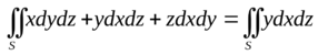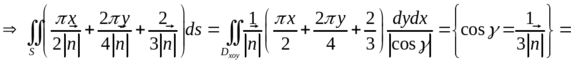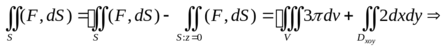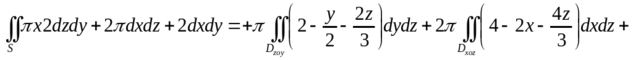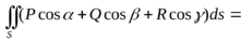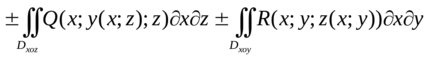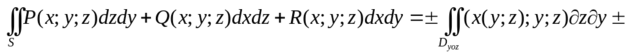 где знаки перед двойными интегралами выбираются в соответствие со знаками направляющих косинусов нормали к поверхности, а соответствующие переменные в подынтегральных функциях выражаются из уравнения поверхности, пределы интегрирования расставляются в соответствие с проекциями поверхности на координатные плоскости.