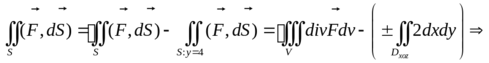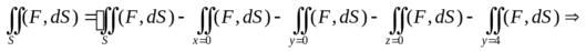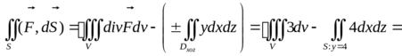 в) Третий способ. Вычислим поток с помощью формулы Остроградского-Гаусса, замкнув поверхность плоскостями: х = 0; у= 0; z = 0, у=4.