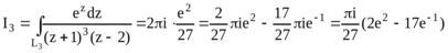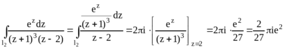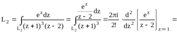 , где l1 - окружность достаточно малого радиуса с центром в точке z=-1, а l2 - окружность малого радиуса с центром в точке z=2. Первый интеграл совпадает с уже вычисленным интегралом I2. Вычислим второй интеграл по интегральной формуле Коши:
