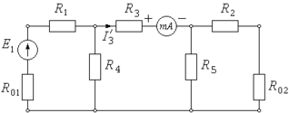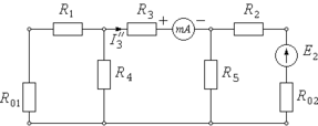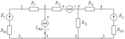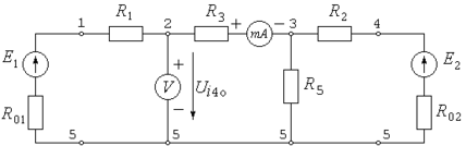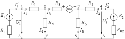 2. Собрать цепь по схеме, приведенной на рис. 2.3. Установить тумблер переключения полярности миллиамперметра в левое положение. При таком положении тумблера показания миллиамперметра считаются положительными, а его полярность соответствует показанной на схеме. Включить источники питания цепи. Приняв (по указанию преподавателя) один из узлов 1…5 цепи за базисный, т.е. считая его напряжение равным нулю, измерить значения напряжений остальных узлов цепи относительно базисного. Вычислить значения токов резисторов I1…I5 и активных ветвей , схемы на рис. 2.3. Сравнить значение тока I3 с показанием миллиамперметра третьей ветви. Заполнить табл. 2.2. 3. Проверить соблюдение первого закона Кирхгофа для первого и третьего узлов цепи. Записать результат. Рис. 2.3 Т а б л и ц а 2.2 5) Значения напряжений узлов и токов ветвей