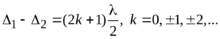 Изменение интерференционной картины на противоположную означает, что на тех участках экрана, где наблюдались максимумы (светлые полосы), будут наблюдаться минимумы (темные полосы). Такой сдвиг интерференционной картины возможен при изменении оптической разности хода лучей на нечетное количество полуволн: