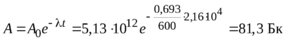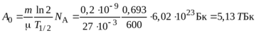 Пример. Определить начальную активность А0 радиоактивного препарата магния Mg27 массой m = 0,2 мкг, а также его активность А через время t = 6 ч. Для магния период полураспада Т1/2 = 10 мин.