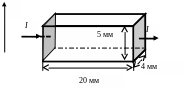 11. Образец кремниевого полупроводника n-типа помещен в магнитное поле с индукцией В = 0,2 Тл (см. рисунок). Размеры образца указаны на рисунке. Через образец течет ток I = 50 мА. Возникающая при этом холловская разность потенциалов UН = 4 мВ.