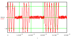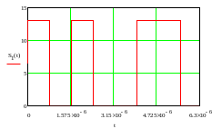 Изобразим фрагмент сигнала, соответствующий первым двум буквам сообщения (первые 2 буквы кодируемого нами сообщения – «са», им соответствует кодовая комбинация 10100110). При построении учтем амплитуду сигнала A =13 В, и длительность посылки τ = 0.8 мкс.