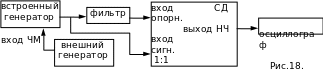 Конфигурация экспериментальной установки показана на Рис.18. Отличие от предыдущего упражнения (Рис.17) заключается в том, что на опорный вход детектора подается выходной сигнал фильтра, а на сигнальный вход - входной сигнал фильтра. Поэтому входные сигналы детектора имеют разность фаз, изменяющуюся в соответствии с модулирующим напряжением. Амплитудная модуляция выходного сигнала фильтра не сказывается, т.к. этот сигнал подается на опорный вход детектора.
