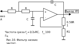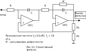ФИЛЬТР. К выходу генератора подключен селективный фильтр (Рис.12), служащий для получения амплитудно- и фазо-модулированного сигнала из частотно-модулированного сигнала генератора. Фильтр состоит из двух интегрирующих звеньев, охваченных положительной обратной связью, и имеет амплитудную и фазовую характеристики, аналогичные характеристикам обычного колебательного LCR - контура.