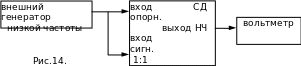 2.1. Изучение амплитудной характеристики детектора. Схема измерения показана на Рис.14. На опорный и сигнальный (1:1) входы детектора подается напряжение внешнего низкочастотного генератора с частотой порядка 10 кГц, выходное постоянное напряжение детектора измеряется вольтметром. Изменяя амплитуду напряжения генератора в пределах от 0 до 2В, проверьте, что выходное постоянное напряжение линейно зависит от амплитуды входного напряжения. Определите коэффициент передачи детектора - отношение выходного напряжения к амплитуде входного сигнала. Сравните полученное значение со значением, ожидаемым для гармонического сигнала и экспериментальной установки с приведенными выше параметрами.