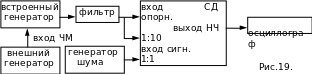 Схема измерения показана на Рис.19. Она представляет собой схему детектирования амплитудно-модулированного сигнала (Рис.17), в которой в качестве сигнального входа детектора используется вход 1:10, а ко входу 1:1 подключен генератор шума, создающий помеху.