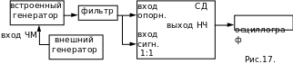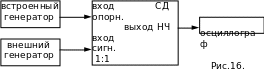 2.3. Измерение полосы пропускания детектора. Схема измерения показана на Рис.16. На опорный вход подается сигнал встроенного генератора, источником сигнала служит внешний низкочастотный генератор. При перестройке частоты внешнего генератора вблизи частоты встроенного генератора на выходе детектора будет наблюдаться гармонический сигнал. Его частота равна разности частот входных сигналов детектора. Изменение разностной частоты будет сопровождаться изменением амплитуды выходного сигнала в соответствии с амплитудно-частотной характеристикой фильтра низких частот детектора.