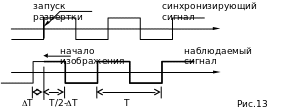 При использовании однолучевого осциллографа один из сигналов (например, входной сигнал фильтра) подается на вход внешней синхронизации и им запускается развертка осциллографа, а другой сигнал (например, выходной сигнал фильтра или компаратора) подается на вход вертикального отклонения и наблюдается на экране. По виду изображения можно определить временной сдвиг наблюдаемого сигнала относительно синхронизирующего сигнала. Для примера на Рис.13 показано формирование изображения для случая, когда наблюдаемый сигнал опережает синхронизирующий, и развертка запускается положительным (нарастающим) фронтом сигнала.