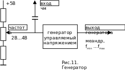 ГЕНЕРАТОР. Генератор (Рис.11) собран на специализированной интегральной микросхеме, вырабатывающей выходной сигнал прямоугольной формы. Частота генерируемых колебаний зависит от величины напряжения, подаваемого на управляющий вход микросхемы. Связь между напряжением и частотой близка к линейной.