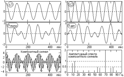 Специальный модулирующий сигнал формируется из двух сигналов - монофонического и разностного. Монофонический сигнал образуется суммой сигналов в каналах, разностный – разностью сигналов:smono(t) = s1(t) + s2(t),