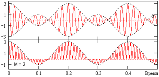 Замечательной особенностью синхронного детектирования является полная независимость от глубины модуляции, т.е. коэффициент модуляции сигнала может быть больше 1. Пример синхронного детектирования перемодулированного сигнала приведен на рис. 15.1.10.Однако при синхронном детектировании требуется точное совпадение фаз и частот опорного колебания демодулятора и несущей гармоники АМ-сигнала. При сдвиге фазы опорного колебания на относительно несущей частоты выходной сигнал демодулятора оказывается умноженным на косинус фазовой ошибки: