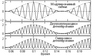 Другой распространенный метод – синхронное детектирование. При синхронном детектировании модулированный сигнал умножается на опорное колебание с частотой несущего колебания. Без учета фазовых углов колебаний: