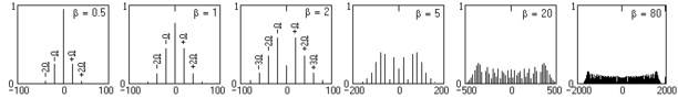 Рис. 15.2.3. Модули спектров ЧМ сигнала при разных индексах модуляции.