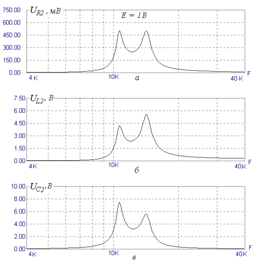 Следует отметить, что хотя у одинаковых контуров (рис.83) при > 1 амплитуды токов на частотах связи одинаковы (рис.84, а), амплитуды напряжений на индуктивности и емкости (рис.84, б, в) различны, поскольку