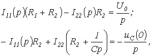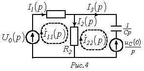 Во втором случае, т.е. при , для цепи на рис. 3 следует составить операторную схему замещения, которая приведена на рис. 4. Изображения токов в ней могут быть определены любым методом расчета линейных цепей, например, методом контурных токов: