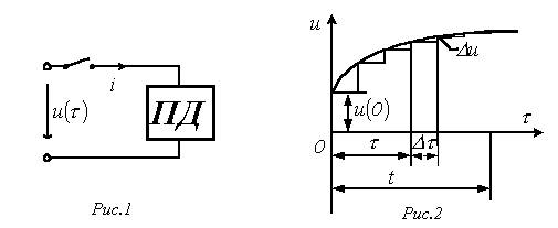 Пусть в момент времени к цепи с нулевыми начальными условиями (пассивному двухполюснику ПД на рис. 1) подключается источник с напряжением произвольной формы. Для нахождения тока в цепи заменим исходную кривую ступенчатой (см. рис. 2), после чего с учетом, что цепь линейна, просуммируем токи от начального скачка напряжения и всех ступенек напряжения до момента t, вступающих в действие с запаздыванием по времени.