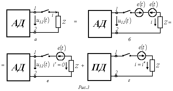 Методику сведения цепи к нулевым начальным условиям иллюстрирует рис. 3, на котором исходная схема на рис. 3,а заменяется эквивалентной ей схемой на рис. 3,б, где . Последняя в соответствии с принципом наложения раскладывается на две схемы; при этом в схеме на рис. 3,в составляющая общего тока равна нулю. Таким образом, полный ток равен составляющей тока в цепи на рис. 3,г, где исходный активный двухполюсник АД заменен пассивным ПД, т.е. схема сведена к нулевым начальным условиям.