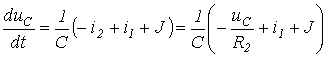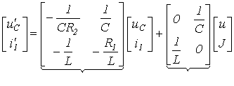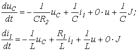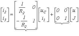 Здесь и - столбцовые матрицы соответственно переменных состояния и их первых производных по времени; - матрица-столбец источников внешних воздействий; - столбцовая матрица выходных (искомых) величин; - квадратная размерностью n x n (где n – число переменных состояния) матрица параметров, называемая матрицей Якоби; - прямоугольная матрица связи между источниками и переменными состояния (количество строк равно n, а столбцов – числу источников m); - прямоугольная матрица связи переменных состояния с искомыми величинами (количество строк равно числу искомых величин к, а столбцов – n); - прямоугольная размерностью к x m матрица связи входа с выходом.