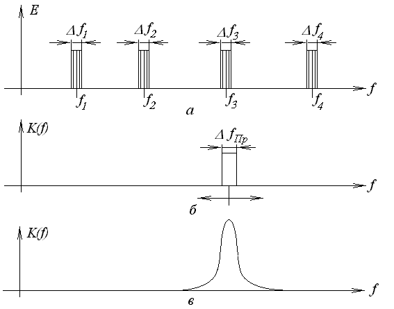 Для выделения одного из сигналов приемное устройство должно иметь частотную характеристику вида (рис.48, б). Приемное устройство пропускает только частоты, лежащие внутри полосы . Если, например, полоса частот совпадает с , приемное устройство выбирает из всех воздействующих на нее колебаний лишь колебания третьего источника. При идеальной характеристике (рис.48, б) воздействие всех остальных источников не вызывает никаких откликов.