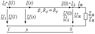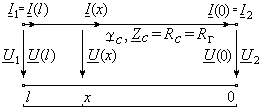 В общем случае исходными являются выражения с экспоненциальными функциями мнимого аргумента, определяющие комплексы действующих значении напряжения U(x) и тока I(x) в произвольном сечении с координатой x (0 x l), отсчитываемой от конца отрезка линии без потерь (рис. 15):