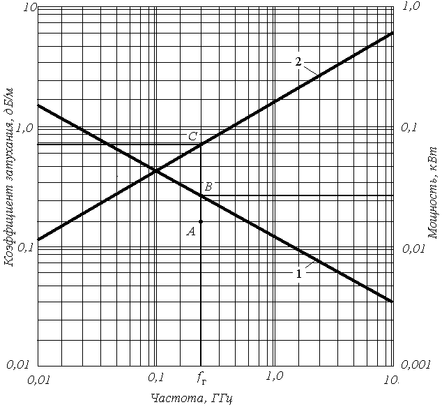 На рис. 10 для примера представлен график частотных зависимостей предельно допустимой мощности Рko = Рko(f) и коэффициента затухания на единицу длины = (f) [дБ/м] радиочастотного кабеля РК 50-2-12 ГОСТ 11326.64-79. На этом графике указанны значения мощности генератора Рг(fг) (точка A) и предельно допустимой мощности Рko = Рko(fг), передаваемой кабелем в согласованном режиме (при k = 1) (точка B).
