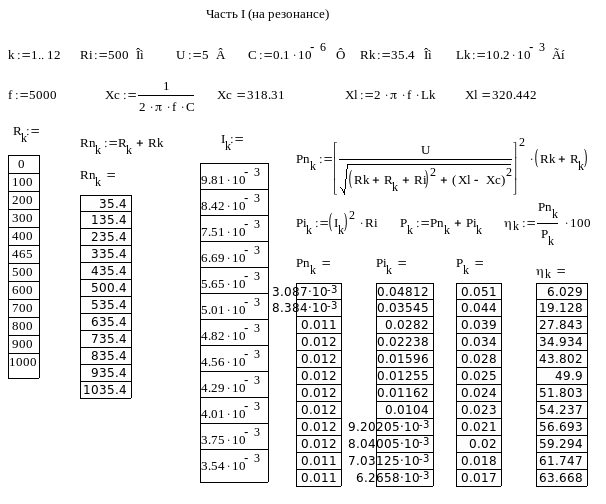 Вывод: при резонансной частоте максимальная мощность выделяется на согласованной нагрузке (Rk + R = Ri).
