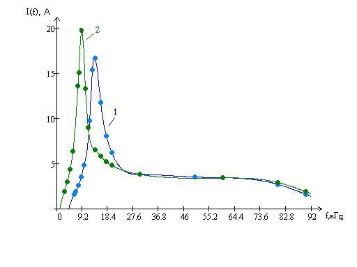 АЧХ контура I(ƒ) (ƒрез =14 кГц, I = 16.7 A)