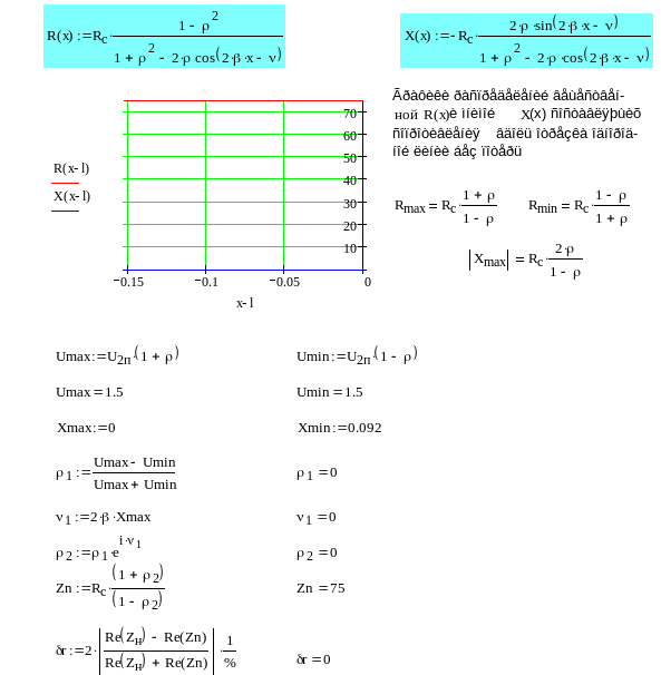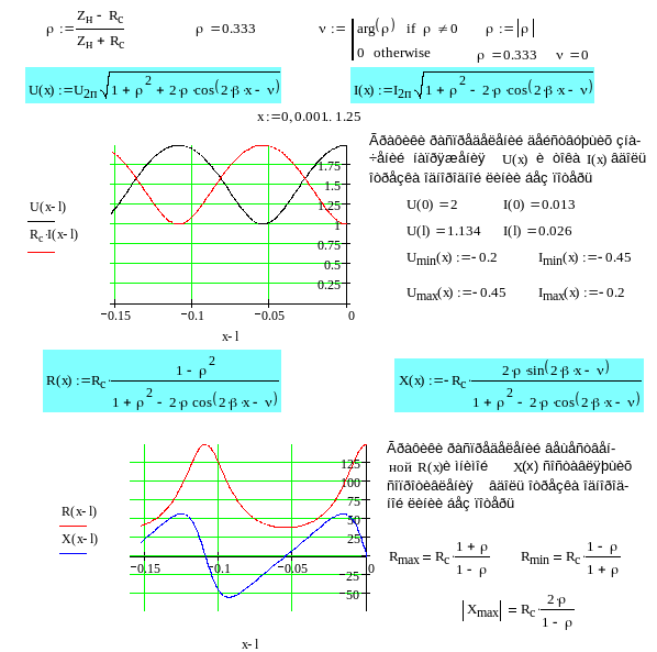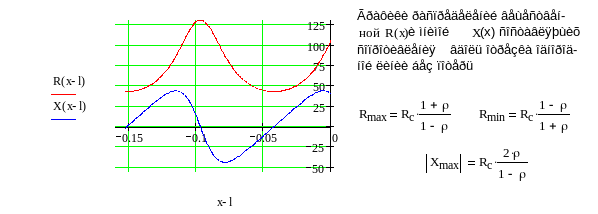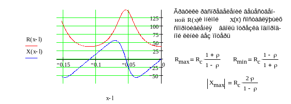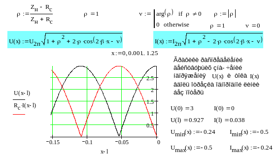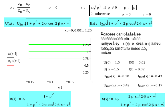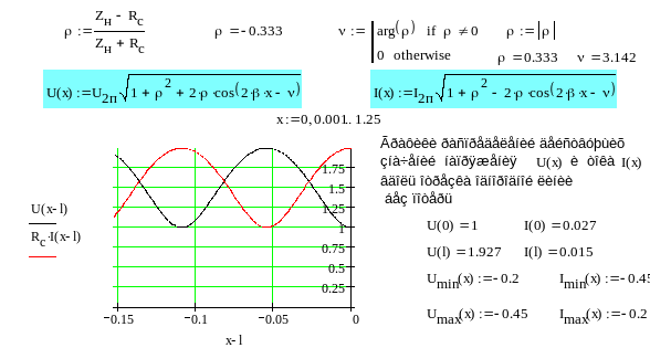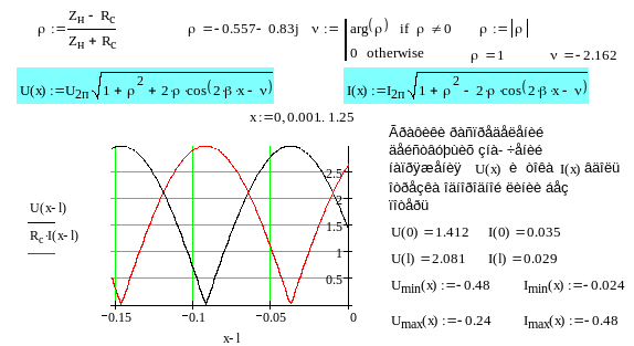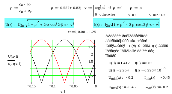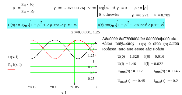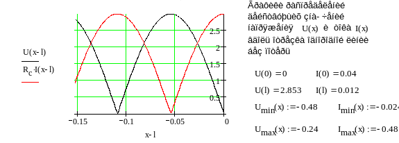 получить на экране монитора графики распределения действующих значений напряжения U(x) и тока I(x) вдоль отрезка однородной линии без потерь при заданной нагрузке. Отсчет координаты “x” здесь и в дальнейшем ведется в метрах от конца линии к началу. Записать максимальное и минимальное значения напряжения, а также – координаты xmax и xmin ближайших к началу координат максимума и минимума напряжения.