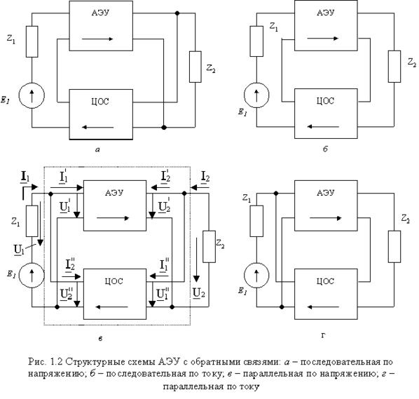 Действие ОС по напряжению (рис.1.2, а и в) не проявляется в режиме короткого замыкания на выходе (Z2 = 0), а ОС по току – в режиме холостого хода (