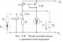 В усилителе с динамической нагрузкой (рис. 3.30) транзистор VT1 является УЭ. Его нагрузка (динамическая) – ГСТ (токовое зеркало) на транзисторах VT3 и VT4. Транзистор VT2 выполняет функцию токовой защиты. При нормальных условиях он закрыт и не оказывает ни какого влияния на работу каскада.