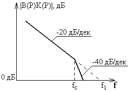 имеет место переход с одной асимптоты на другую. Таким образом, элементы Rдоп и С приводят к тому, что взаимный наклон АЧХ K(f) и 1/B(f) в точке пересечения, как и в схеме рис.4.14,а составит 20 дБ/дек.