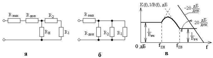 Рис.4.15. Эквивалентные схемы ЦОС на низких (а), высоких частотах (б) и АЧХ (в),