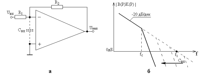 Рис.4.13. Компенсация входной емкости: а – схема; б - АЧХ