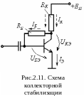 этой схеме (рис. 2.11) стабилизация осуществляется за счет параллельной ООС по напряжению. Пусть под действием дестабилизирующего фактора возрос ток коллектора, а, значит, и ток эмиттера