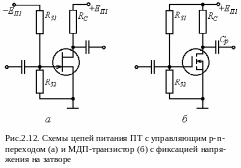 , то питание необходимо осуществлять от двух источников питания (рис. 2.12, а). У МДП-транзисторов с индуцированным каналом (рис. 2.12, б) полярность этих напряжений совпадает, поэтому требуется один источник питания (рис. 2.12, б). ПТ со встроенным каналом могут работать с напряжением